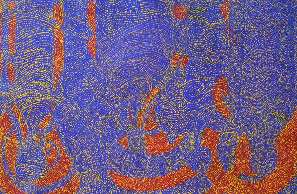 This in a painting about Yindjibarndi Country. A land full of stories told by old people and handed down to the next generation, to the next generation. This painting is made with designs and patterns shown to me by God. The patterns of the animals and the circles that I do represent healing that formed into the living country. We see our living country in our minds but spoken from out hearts and how old people lived and learned from their parents told to us by our parents