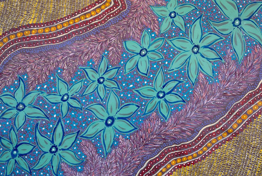 This painting is about the river on my Country and the wildflowers that grow along its banks. The river rises and the flowers bloom bright against the earth, showing their strength as they return each season. The patterns and lines illustrate the patterns along the waters edge. When I paint I think about being the beauty of the landscape and my family connection to Country. These freshwater places are important to us.